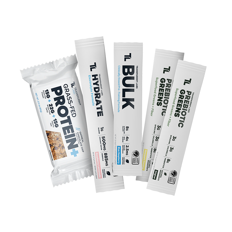Try Bulk Pre-Workout, Hydrate, Prebiotic Greens, and a Protein+ Bar.